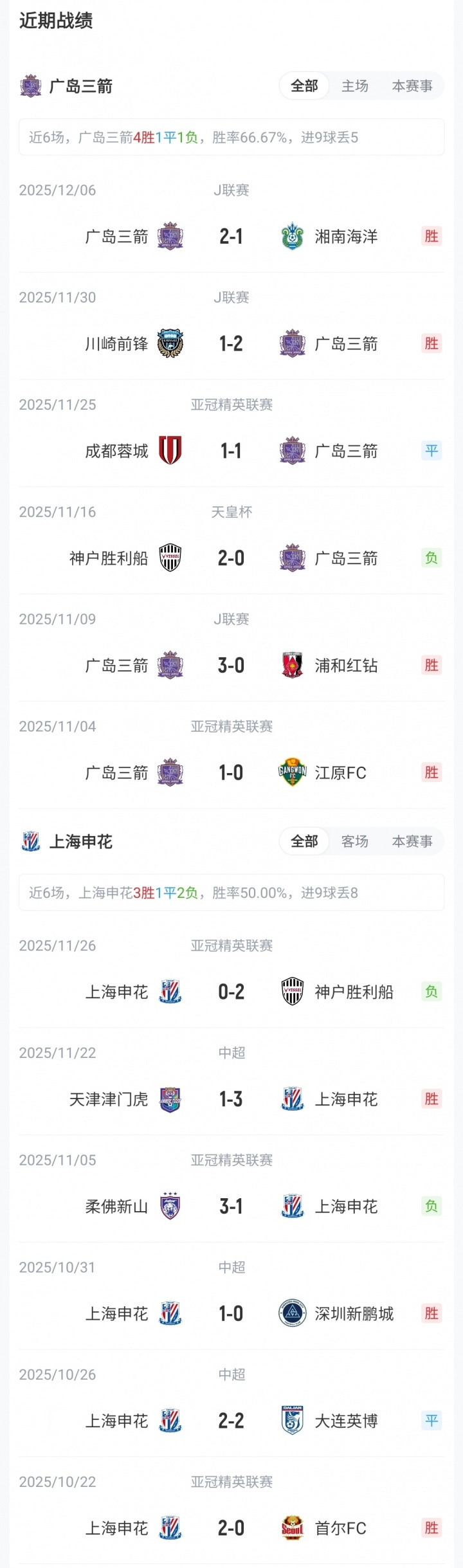 目前亚冠精英联赛东亚区积分榜上,上海申花1胜1平3负积4分,位列第11;广岛三箭2胜2平1负积8分,位列第5。